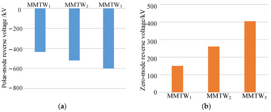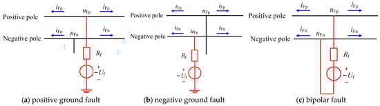 According to Figure 3, the modulus’ initial-voltage-fault traveling wave of the bipolar DC system under positive, negative, and bipolar ground fault can be expressed as shown in Equations (1)–(3) [16]: