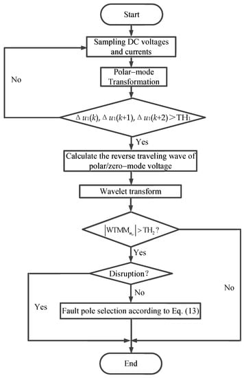 Based on the above analysis, a fault detection and identification method based on single-ended traveling wave protection is designed, and the flow chart is shown in Figure 5 [21,22].