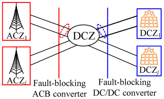 A DC zone (DCZ) in a DC network is selected as the research object to illustrate the zonal protection strategy. Assume that the DC zonal DCZ is connected to multiple AC zones (ACZs), ACZ1, ACZ2, ACZi, while the DC side is connected to multiple DC zones, DCZ1, DCZ2, DCZj, as shown in Figure 6. The red line in Figure 6 indicates the protection boundary between the DCZ and each AC system, including the converter with fault self-clearing capability and the AC side circuit breaker without fault self-clearing capability. The blue line in Figure 6 represents the protection boundary between the DCZ and DC areas, including a DCCB and DC/DC converter with fault-blocking capability.