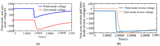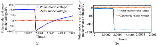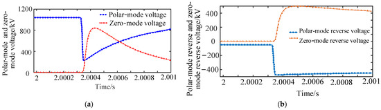 Bipolar metal grounding short-circuit fault result: (a) polar-mode and zero-mode voltage waveforms. (b) Traveling wave waveforms of polar-mode reverse and zero-mode reverse voltage.