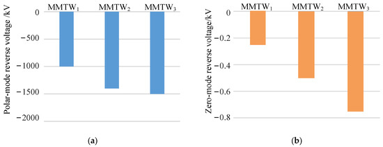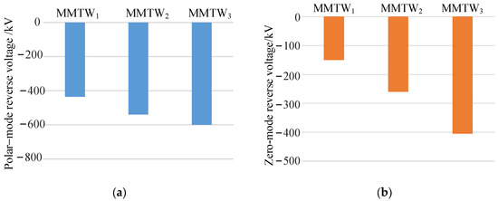 Similarly, fault feature extraction is performed for the polar-mode reverse-voltage and zero-mode reverse-voltage traveling waves of the DC lines, and the wavelet modulus maxima at each scale are calculated. The calculation results are shown in Figure 12. The calculation result of the wavelet modulus maximum of the polar-mode reverse-voltage traveling wave is similar to that of the positive fault, and it can be determined as an internal zone fault. The wavelet modulus maximum of the zero-mode reverse-voltage traveling wave under a negative fault is exactly the opposite of that under a positive fault. There is a wavelet modulus maximum at each scale, and the value is positive, at about 390 kV. Therefore, according to the fault pole selection criterion, the fault can be determined as a negative fault from the maximum value of the zero-mode reverse-voltage traveling wave wavelet modulus.