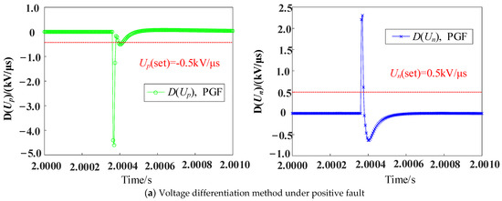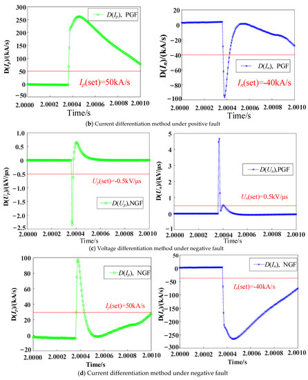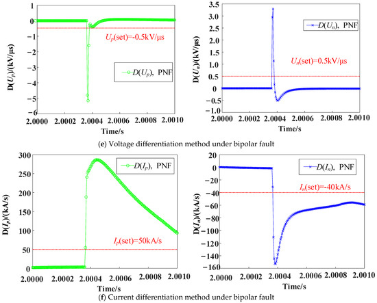 In order to prove the superiority of the fault detection method based on single ended mode inverse traveling waves proposed in this paper, it is compared with voltage differentiation and current differentiation methods [32]. In this paper, it is established that a positive, negative, and neutral metallic fault occurs at the midpoint of the line. The differential variation characteristics of voltage and current on the line are shown in Figure 15. The Voltage differentiation or current differentiation method can be used to realize the pole selection criterion of faults according to the magnitude of the ratio of the fluctuation coefficient when detecting faults. However, in order to ensure the accuracy of protection, at least three sampling points are needed to meet the fault discrimination conditions before fault pole selection can be carried out. The fault discrimination strategy proposed in this paper only needs to meet the discrimination conditions to directly carry out fault pole selection, which has better quick activity.