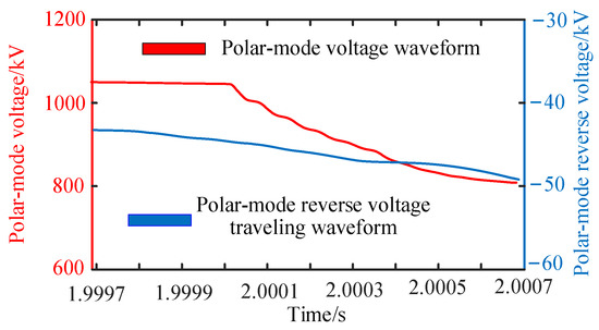 According to Equations (1)–(3), when the positive and negative ground faults occur on the DC line, the corresponding zero-mode initial-voltage-fault traveling wave polarities are positive and negative, respectively. When a bipolar short-circuit fault occurs, the corresponding zero-mode initial-voltage-fault traveling wave is zero. Therefore, fault pole selection can be effectively performed based on the zero-mode fault traveling wave. For these three faults, there is a negative polarity of the initial-voltage-fault line wave, so the fault line can be discerned based on the polar-mode line wave.