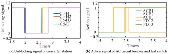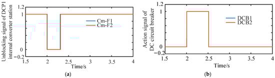 Protection boundary element action signal in DCZ1. (a) Unblocking signal of converter station in DCZ1; (b) DCZ1 protection boundary of DC circuit breaker action signal.