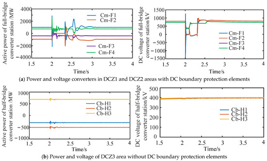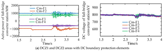 It can be seen from Figure 19 that when the fault occurs after 2 s, the active power and DC voltage of the full-bridge converter station in DC regions DCZ1 and DCZ2 fluctuate sharply. However, the fluctuation amplitude of DCZ2 is smaller, and the DC voltage drops to about 500 kV instantaneously, which is not as low as the drop in the full-bridge converter station in DCZ1.