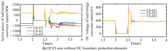It can be seen from Figure 20 that the converter stations Cb-H1H and Cd-E1 are the nearest and farthest from the fault point, respectively, corresponding to the fastest and slowest locking times. The blocking times of converter stations Cb-H1, Cb-H2, Cb-H3 and Cd-E1 are about 2.002 s, 2.003 s, 2.004 s and 2.005 s, respectively. Since the converter stations in DCZ3 are all half-bridge MMC and have no fault-clearing capability, the circuit breakers on the AC side of each converter station are further opened.