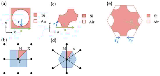 A 2-D PC is formed by periodically arranging holes or pillars in the host material. With different arrangement methods, the PCs can be classified into several commonly used lattices, which include square lattices, triangular lattices, and honeycomb lattices. Figure 1a depicts the unit cell of a hole-type 2-D square lattice PC. The PC consists of air holes in a silicon host. The lattice constant and the radii of air holes are denoted by a and r, respectively. In practice, the structure can be realized by etching a silicon wafer with a thickness 10 times larger than the lattice constant. Figure 1b represents the reciprocal lattice of a 2-D square lattice. The first Brillouin zone and the reduced Brillouin zone are represented by the blue and pink areas in Figure 1b. The reduced Brillouin zone is obtained by reducing all of the symmetries in the first Brillouin zone in the point group of the lattice. The BS was then solved within the reduced Brillouin zone to represent the dispersion in the whole crystal sufficiently.