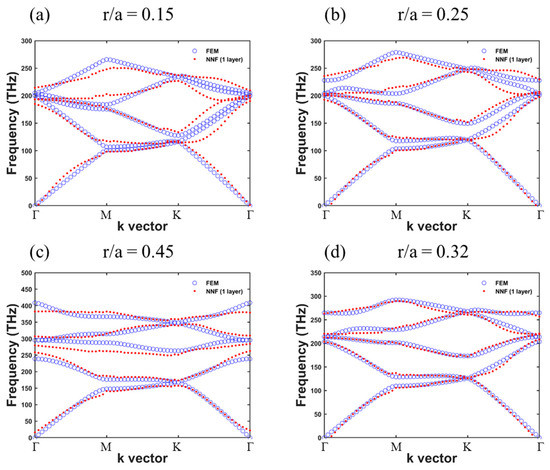 The BS (red dots) predicted by the ANN are plotted with those calculated by the FEM. As can be seen in Figure 2a–c, the predicted eigenfrequencies agree well with those calculated results, and the correlation coefficient R = 0.99841. In Figure 2c, the BS also shows a complete band gap between the first and second bands. Due to the low-frequency location of the band gap, the bandgap information can be read in the predicted band structure as well as the FEM results. In Figure 2d, the BS of the PC with r/a =0.32 predicted by the ANN is depicted with those calculated by the FEM. From the BS of r/a = 0.32, we can find an opening gap between the first and second bands. Considering the complete band gap within the BS of r/a = 0.45, the gradually opened gap observed during the r/a varying process can be a hint of the existence of the band gap. Fortunately, this information can also be observed from the predicted results. It should be noted that this group of data is not included in the training dataset. The predicted results then confirm the prediction performance of the ANN with just 10 neurons.