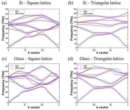 FEM-calculated (blue circles) and predicted (red dots) band structures of PCs made of Si in (a) square lattice and (b) triangular lattice and glass in (c) square lattice and (d) triangular lattice with r/a = 0.32 and 25 neurons in the hidden layer.