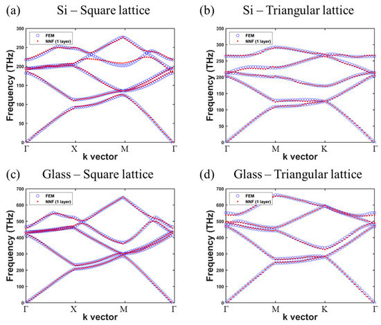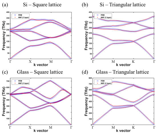 To resolve this issue, the number of neurons in the hidden layer was increased. The number of neurons can be chosen as a larger number, forming a further complex ANN. However, more neurons or even more hidden layers also cause more training time. Therefore, we set 25 neurons for appropriate predicted results and training time. The prediction results are shown in Figure 5. The same BSs with r/a = 0.45 were used to present the results. As can be seen in Figure 5, the accuracy in all four BSs in square lattices and triangular lattices was effectively optimized and even better than those prediction results formed by the original ANN. The correlation coefficient of the net for square lattices and triangular lattices increased to 0.99977 and 0.99979. In Figure 5b, the complete band gap information can be seen to be as clear as the FEM-calculated BS.