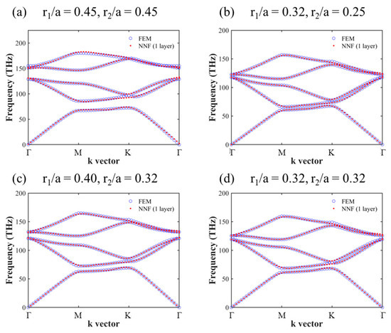 In Figure 7, the band structures of the honeycomb lattice with different r1/a and r2/a pairs are depicted. In Figure 7a, both the r/a ratio of the holes are chosen to be 0.45 to present the training performance. As can be seen in the figure, the predicted results produced by the 25-neuron ANN fit well with those calculated by the FEM, shown in blue circles, and the correlation coefficient R = 0.99985. To confirm the prediction ability, the BSs are calculated by changing one or both the radii ratios of the holes to 0.32. In Figure 7b–d, the BSs of the honeycomb lattice PCs with r1/a = 0.32 and r2/a = 0.25, r1/a = 0.4 and r2/a = 0.32, and r1/a = 0.32 and r2/a = 0.32 are depicted, respectively. Through the figures, we can see the perfect prediction results in each pair of radii groups.