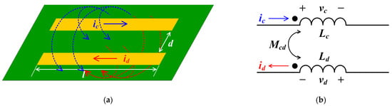 Figure 2a shows the magnetic flux generated when two conductors with opposite current directions are adjacent. Unlike in Figure 1a, magnetic fluxes are added between the conductors and canceled outside. Therefore, the distance between two conductors must be reduced. Figure 2b shows the electrical equivalent model of Figure 2a. The induced voltage vc and vd in each conductor by currents ic and id can be expressed using the same principles as (1) and (2):