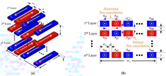 Figure 3a shows the conceptual configuration of the proposed 3-D lattice structure. The blue and red blocks represent the conductor segments, and the yellow and white arrows represent the directions of the current in each segment, where snm represents the mth segment of the nth layer. In the first layer, conductors with opposite current directions are placed adjacent to each other to improve the magnetic flux cancellation within the layer. In the second layer, the segments are arranged, such that the current direction is opposite to that of the vertically adjacent layer, to improve interlayer flux cancellation. Subsequently, the first and second layers are set in pairs and stacked repeatedly to form a multilayer structure to enhance the magnetic flux cancellation. Figure 3b shows the magnetic flux cancellation between adjacent layers in the proposed structure. Horizontal magnetic flux cancellation occurs between two adjacent segments within a layer, and vertical flux cancellation occurs between adjacent layers. Therefore, the proposed 3-D lattice structure can effectively reduce the parasitic inductance of the PCB by generating both vertical and horizontal magnetic flux cancellations, which can increase with an increase in the number of segments or layers.