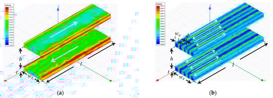 Figure 4 shows a comparison of the magnetic flux density in the conductor before and after the application of the proposed structure using ANSYS MAXWELL. In both cases, the width wc, thickness t, length l, and distance between layers h is 54 mm, 10 mm, 200 mm, and 50 mm, respectively. The white arrow indicates the direction of the current flowing through the conductor. In Figure 4a, two conductors with opposite current directions are arranged vertically, which results in only vertical magnetic flux cancellation. As shown in Figure 4b, the proposed structure is applied by separating the conductor into five segments. The width of segment wo is 10 mm, and the distance d between the segments is 1 mm. The flux density of the conductor is reduced significantly, compared to that in Figure 4a, because of the horizontal and vertical flux cancellations. This implies that the proposed structure has a smaller parasitic inductance. Table 1 lists the simulated parasitic inductances of the two cases shown in Figure 4 using ANSYS Q3D. As summarized in Table 1, the parasitic inductance of the proposed structure is reduced by 55.8% to 43.38 nH compared to 98.2 nH, when only magnetic flux is canceled vertically.