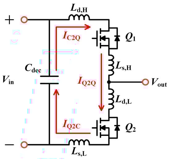 Figure 6 shows the parasitic inductance and current flow of a half-bridge leg during switching transients. The parasitic inductance consists of the high-side drain inductance Ld,H of high-side devices Q1, high-side source inductance Ls,H, low-side drain inductance Ld,L of low-side devices Q2, and low-side source inductance Ls,L. The current during the switching transients includes current IC2Q flowing from the decoupling capacitor Cdec to Q1, a current IQ2Q flowing from Q1 to Q2, and a current IQ2C flowing from Q2 to Cdec. The direction of the current can be reversed based on the switching state of the device.