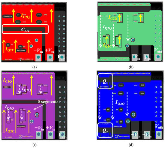 Segments were also added to generate horizontal flux cancellation, as in Figure 7b. Finally, Q1 and Q2 were mounted on the bottom layer, and IQ2Q flowed to generate a vertical flux cancellation with inner layer 1. As explained in the design procedure, the parasitic inductance can be reduced further if inner layers 1 and 2 are set as reference layers and stacked between the top and bottom layers.