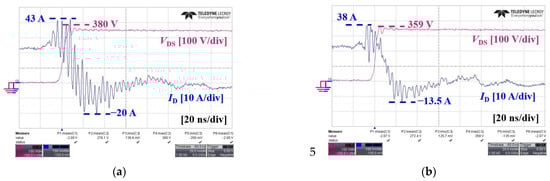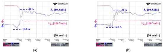 Figure 10 shows the drain-source voltage and drain current of Q2 during the turn-off transient. In the prototype with a conventional structure [], VDS increases up to 380 V and ID shows a fluctuation range from 43 A to −20 A, as indicated in Figure 10a. Figure 10b shows the turn-off transient waveforms of the proposed structure. Compared with the conventional structure, the overshoot of VDS decreased to 359 V, and the maximum and minimum magnitude of ID decreased to 38 A and −13.5 A, respectively. The experimental results in Figure 10 indicate that the overshoot of VDS is reduced by approximately 5.5%, and the fluctuation of ID is reduced by approximately 18% with the proposed structure, meaning that the parasitic inductance is effectively reduced.