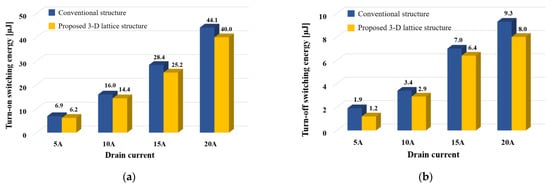Improving switching characteristics by reducing parasitic inductance can increase the efficiency of a power converter as it reduces the switching energy. Figure 12 shows a comparison of the switching energy for a conventional vertical lattice structure and that for the proposed structure, depending on the magnitude of ID. The proposed structure has lower turn-on and turn-off switching energies than those of the conventional structure; the turn-on energy is reduced by approximately 10% and the turn-off energy by approximately 14%.
