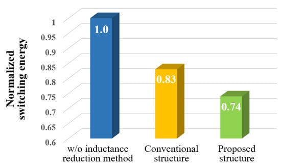 Figure 13 shows that the normalized switching energy depends on the inductance reduction method. The switching energy without inductance reduction was used as a reference for normalization. The proposed structure reduces the total switching energy by more than 10% compared to the conventional structure [], and therefore, the switching energy is reduced by 26% compared to the case without an inductance reduction method.
