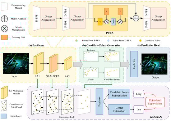 Illustration of SGSSD framework. (a) Backbone network. It takes the raw point cloud as input and generates global features through several SA layers, PCEA is added after SA2. D-FPS and F-FPS mean FPS in Euclidean and feature space, respectively. (b) Candidate points generation layer. The points after shifts are used for prediction, we call them candidate points. (c) Prediction head. (d) Auxiliary module SGAN. It is detachable after training.