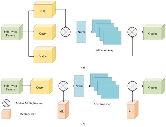The matrix M is independent of the overall dataset and acts as a memory unit to calculate the attention for each point. We use to update M. and are used as the key and value; this is consistent with self-attention. is the attention map and . It is sensitive to the scale of the input, so we separately normalize columns and rows by the Norm module: