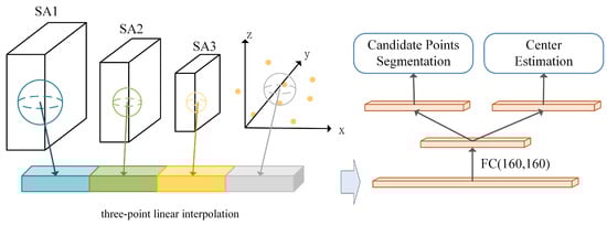 Interpolated Features Generation. First, we denote as the candidate points where p represents the coordinates and f is the feature vector. We use a three-point linear interpolation with the inverse distance weighted average among all the points in a neighboring region [], and the three nearest neighbors are chosen to calculate the interpolated features. We denote as the points after downsampling module SA1, SA2, SA3, and as the interpolated feature. is a ball region in each stage, so the feature vector is:
