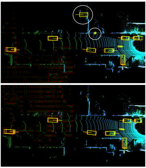 Data Enhancement. The dataset is augmented by random flipping, rotating, scaling the point cloud and GT-AUG []. The rotation angle is subject to a uniform distribution between and , and the whole point cloud scales with a random scaling factor between 0.95 and 1.05.