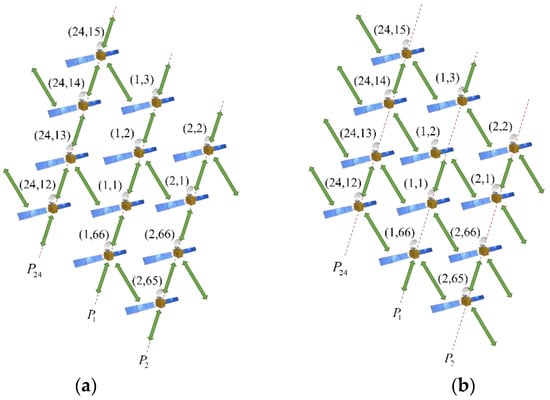 Satellites can establish ISLs with other satellites in the same orbital plane (OP) or different OPs in a mega constellation. In order to take into account the east–west connectivity of the satellites, a uniform connection rule is defined: when , the odd-numbered satellites in each orbit connect to the satellite with the shortest distance from the adjacent orbit on the left, allowing hop-by-hop transmission along the orbital direction; the even-numbered satellites are only connected to the shortest distance satellite in the right adjacent orbit and complete hop-by-hop transmission along the orbit in the opposite direction. This ensures that two adjacent satellites in the same orbit are a pair, avoiding duplicate connections and that the two closest satellites in adjacent orbits are connected [19]. Since there is only one link between the different satellites, if the connection of the adjacent orbital links between and is specified, the satellite connections on can be predicted directly [20].