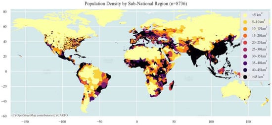 Global population density by provincial administrative division. The above global population density data are derived from the WorldPop database. https://hub.worldpop.org/geodata/listing?id=76 (accessed on 20 December 2022) [25].