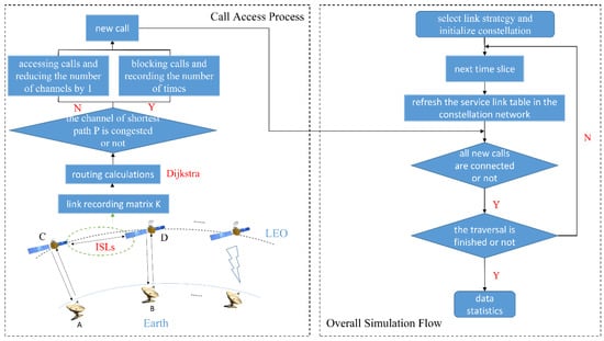 In order to gain a deeper understanding of the communication performance of the satellite network, a unified maximum service time strategy simulation was adopted to simulate the call test between the earth station and the satellite, minimizing the number of link switches in the process from the earth station to the satellite. The general flow of the simulation is shown in Figure 4, and the specific steps are as follows: