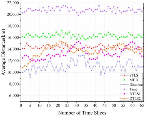 The dynamic topology generated by the Time strategy has the longest average call distance. Comparing the static topology generated by STLS and MHD policies, STLS has a shorter average call distance while the MHD strategy generates a longer distance for the topology. When comparing the dynamic topology with the static topology, the DTLS1 strategy reduces the average call distance by 7.26%, and the DTLS2 strategy reduces the average call distance by 3.81% compared to the STLS strategy if STLS is used as a benchmark. In the STLS strategy, the distance variation is minor, indicating a more stable link, while all three dynamic policies require reconnection of the link with the switch of the time slice, so the distance variation is more significant.