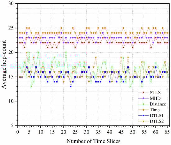 The hop count of STLS is about 3.82% less than that of MHD. Since STLS connects all satellites in the same and adjacent orbits, many hops are required for relaying if the randomly selected ground stations are far away. Still, the MHD network requires more hops than STLS to transmit packets to the location of the destination satellite.