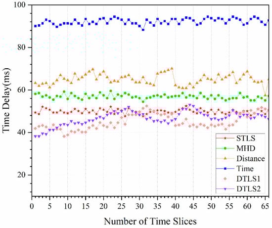 The algorithm used in this paper goes through the dynamic link selection strategy, which can directly launch the connected ISLs according to the changing pattern of time slices, significantly reducing the computation time; therefore, the overall latency of the dynamic strategy is lower than both STLS and MHD.