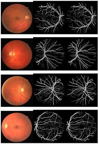 - Kamran, S.A.; Hossain, K.F.; Tavakkoli, A.; Zuckerbrod, S.L.; Sanders, K.M.; Baker, S.A. RV-GAN: Segmenting retinal vascular structure in fundus photographs using a novel multi-scale generative adversarial network. In Proceedings of the International Conference on Medical Image Computing and Computer-Assisted Intervention; Springer: Berlin/Heidelberg, Germany, 2021; pp. 34–44. [Google Scholar]