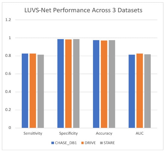 The summary shown in Figure 5 shows the consistency of LUV-Net’s performance across all three datasets that were used for training and validation.