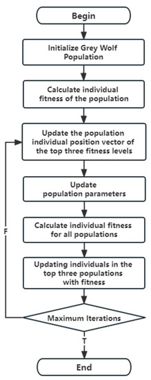 The gray wolf optimization (GWO) algorithm is a swarm intelligence optimization algorithm proposed by Seyedali M et al. [21], which obtains the optimal solution by simulating the hierarchy and hunting behavior between gray wolf groups in nature. The main process is shown in Figure 1. In the GWO algorithm, the gray wolves are divided into four layers according to their status: layer , where layer is the optimal wolf, layer is the suboptimal wolf, layer is the third optimal wolf, and layer is the remaining wolf group. The algorithm is to hunt and hunt the prey by wolf leading subordinate wolf . Assuming the population is composed of N gray wolves, the search space of the optimal solution is k-dimensional, and the i-th gray wolf is expressed as , and the wolves move their positions in the following way.