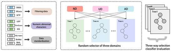 In this paper, we propose a novel approach for detecting abnormal traffic using a three-way selection random forest optimization model. This model combines the principles of three-way decision-making and node-weighted optimization to enhance the classical random forest model and address the uncertainty inherent in abnormal traffic samples. Our model comprises three key components: three-way attribute random selection, three-way selection classifier evaluation, and random forest node weighting. The model structure is shown in Figure 2.