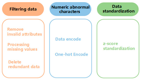 The abnormal traffic samples obtained from the abnormal traffic dataset often contain special characters, null values, invalid features, marking errors, etc. In order to be able to smoothly input the data into the abnormal traffic detection model for training, it is necessary to preprocess the abnormal traffic data. The main process is shown in Figure 3.