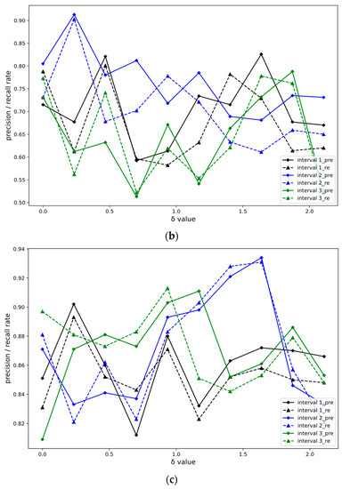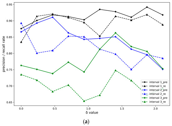 In the dataset, 80% of the samples are randomly selected as the training set and 20% of the samples are used as the test set. The three-way attributes of the model randomly select the hyperparameter in the 0.0001~0.1 value interval according to the gradient. Set to 0.0001~0.001, 0.001~0.01, 0.01~0.1 three groups of experimental intervals for comparison, and named interval 1, interval 2, and interval 3. The value range of parameter is set between 0 and 2.34 according to the experience of parameter adjustment. The precision and recall rate changing with are shown in Figure 6, where the horizontal axis is the value of parameter and the vertical axis is the precision/recall rate.