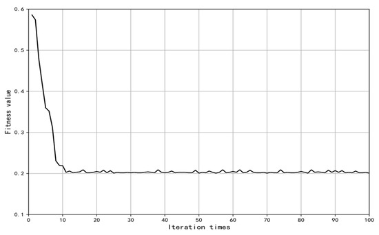 To improve the classification ability of the optimized model, we employed the Gray Wolf Optimization (GWO) algorithm. This algorithm is known for its strong optimization ability, fast calculation speed, and ability to avoid local optima. The GWO algorithm optimized the node coefficients of the model evaluated by the three-way attribute random selection and three-way selection classifiers and determined a set of weighting coefficients. The GWO algorithm was initialized with 20 populations and run for a maximum of 100 iterations. The range of weighting coefficients was set to [0.1, 10], and the initial values were generated randomly. The results of the optimization iteration are shown in Figure 8.