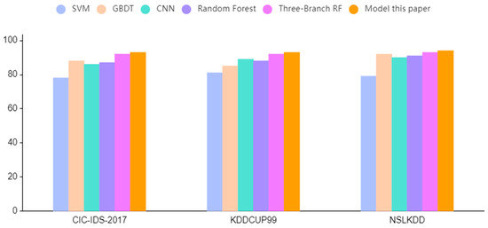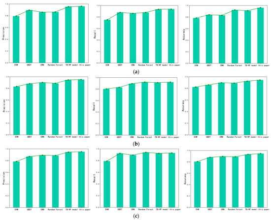Based on the findings in Figure 9, our proposed three-branch random forest optimization model for detecting abnormal traffic outperforms both traditional machine learning algorithms and convolutional neural networks in terms of the F1 score performance index. The model achieved the best results on all three datasets, with an improvement ranging from 0.02% to 0.18% when compared to traditional machine learning detection models. Compared to the CNN model, the F1 score index increased by 0.08%, suggesting that our proposed model outperforms other comparative models in detecting abnormal traffic. In summary, the results of this study demonstrate that our model can achieve superior detection performance in abnormal traffic detection tasks. We further compared the performance differences of different models in Precision, Recall, and Accuracy, as shown in Figure 10.