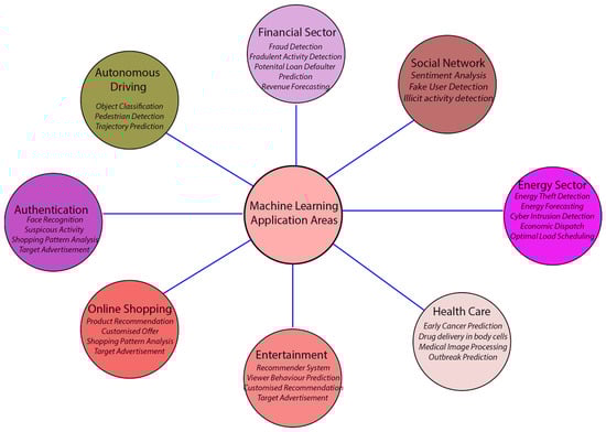 Figure 1 gives a concise overview of the field in which machine learning is now being applied. Machine learning is becoming an increasingly important tool in the banking industry for identifying potentially fraudulent activities. A few of the criteria that play a role in determining whether or not someone is engaging in fraudulent activity include the following: the time of the transaction, the amount involved in the transaction, the geographical location, and information on previous transactions. In a similar vein, the probability that the borrower will fail on their loan may be forecasted if the model is fed with the borrower’s previous credit history as well as his behavior with his previous lenders. The energy industry is another industry that makes extensive use of machine learning. Machine learning is extremely important in many aspects of the energy industry, including but not limited to economic dispatch, customer grouping, optimal load scheduling, and the detection of energy theft. In addition, the implementation of the smart grid, which incorporates a significant amount of renewable resources, has resulted in their network being flooded with thousands of sensors. These sensors send every piece of information to the utility server via a communication network, which has resulted in a new challenge for cybersecurity in the smart grid. The smart grid network is susceptible to a wide variety of cyberattacks, the most prevalent of which include false data injection, denial of service attacks, and botnets. The algorithms for machine learning have a very high degree of accuracy when predicting these types of attacks [2,3,4]. In the field of healthcare, machine learning is utilized to make predictions regarding the early stages of cancer, the prediction of outbreaks, the performance of drugs, etc. In a manner analogous to this, there are other industries like entertainment, e-commerce, autonomous driving, social networks, email service providers, cloud service providers, and others that use machine learning for a variety of activities.