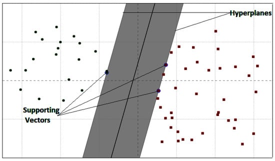 The core idea of SVM is to put each feature vector in high-dimensional space and draw an imaginary high-dimensional line [33], known as a hyperplane. The expression of hyperplane is given in Equation (14)