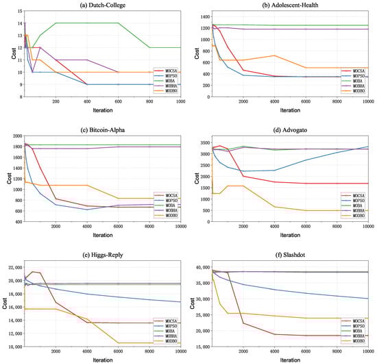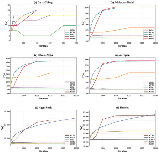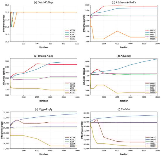 Figure 4 depicts the comparison of the influence spread of four algorithms in six real social networks. The horizontal coordinates of the figure are the number of iterations of the algorithms, and the vertical coordinates are the influence spread values. From Figure 4a–c, it can be seen that the influence spread of the MOCSA algorithm is comparable to MOPSO, and higher than the other benchmark algorithms (MOBA, MOBHA, MODBO). Figure 4d–f show that the influence spread of the MOCSA algorithm decreases after 1000 iterations and converges after 4000 iterations, which is the result of the corresponding reduction of propagation cost.