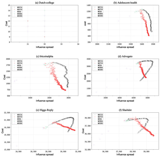 The approximated Pareto Frontiers obtained using different algorithms on the six real social networks are shown in Figure 7. Compared to other solutions, the solutions in MOBA and MOBHA are relatively dense. On the contrary, in MODBO, their distribution is sparse, which may be due to its unique search method. Similar to MOPSO, the proposed algorithm MOCSA provides a larger distribution of solutions in the objective search space. It is obvious that the objective function of minimizing seed costs conflicts with the objective of minimizing seed set size. In most cases, the proposed MOCSA algorithm outperforms the benchmark algorithm. Although MOCSA may not produce the best results in any situation; it is competitive in almost all cases.