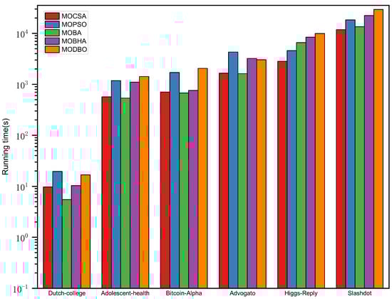 In this section, to evaluate the efficiency of the MOCSA algorithm for solving the LCIM problem, we consider the running time spent by different algorithms as another important performance measure. Figure 8 shows the running time of each algorithm when the number of iterations in six networks is 1000. As can be seen from Figure 8, in Dutch-College, a small network with a node size of , the time required for MOCSA is half that of MOPSO. With the increase in network size, the MOCSA algorithm continues to maintain the speed advantage. On Adolescent-health, Bitcoin-Alpha, and Advogato networks with nodes, the running time of MOCSA is equivalent to that of MOBA, which is only 40% of that of MOPSO. In larger networks with nodes, MOCSA still performs well. For example, in Slashdot network, the running time of MOCSA is 11,858.877 s, which is 64% of MOPSO and half of MOBHA. MODBO performs unsatisfactorily on almost all networks, with a runtime of 29,357.027 s on the Slashdot network. Moreover, with the increase in iterations, the trend of runtime growth far exceeds that of other algorithms. In general, compared with the other algorithms, MOCSA has a lower time cost and is more suitable for extending to large-scale networks.