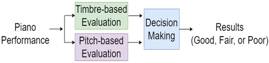 Motivated by this, the aim of this study is to design a system for students which can automatically evaluate a piano performance in terms of various musical aspects, including dynamics, expressiveness, rhythm, articulation, timbre, pitch, and chords. The system may help piano learners to determine the level of their playing skill and thereby make improvements quickly [2]. The assessment of piano playing skills requires the evaluation of a variety of skills in the context of piano instruction, particularly for young children. Therefore, utilizing computer-based techniques offers solutions to problems in the field of education and learning and can assist in developing skills in face-to-face instruction at various levels of skill. In this research, we provide timbre- and pitch-based assessment methods, as piano performance is a combination of multidimensional musical abilities, including dynamics and volume, rhythms and techniques, hand and body postures, and facial expressions.