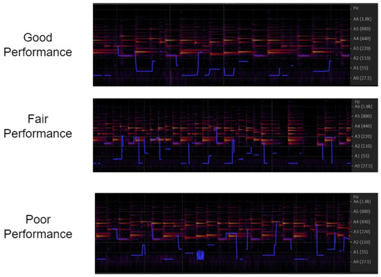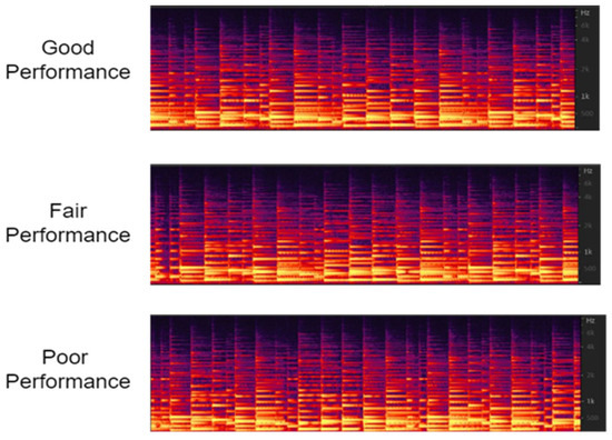 Figure 2 shows the spectrogram of the examples of “Good”, “Fair”, or “Poor” piano performances for playing the line “Lay thee down now and rest, may thy slumber be blessed” in Brahms’ Lullaby. The x-axis and y-axis of a spectrogram represent time and frequency [16], respectively. The brightness of the spectrogram represents amplitude, where darker pixels indicate smaller values and brighter pixels indicate larger values. Some observations can be made as follows. In a good performance, the resulting amplitudes are relatively stable for every played note. In contrast, in a fair performance, we can see from some discontinuous amplitudes that there are mistakes for one or two notes during playing. As the mistakes in a fair performance are minor, we consider the performer’s skill is at moderate level. In the poor performance, we can see that the resulting amplitudes are unstable, compared to the good performance example.