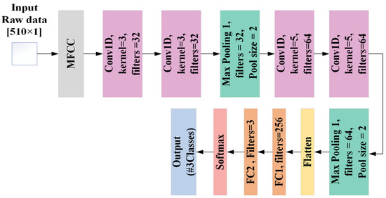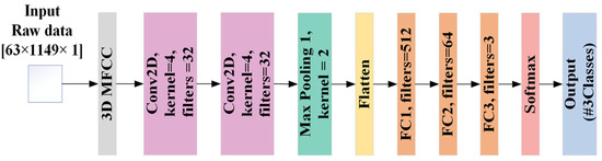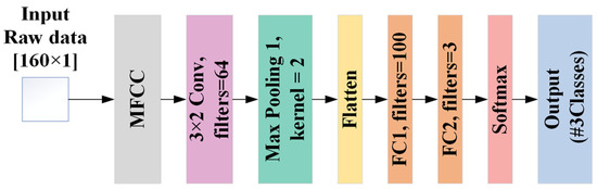 As previously mentioned, in the first convolutional phase, the current input size is 160 × 1 on a single convolutional layer with a kernel size of 3 × 2 with 64 filter sizes and pooling the features via a Max Pooling layer with a kernel size of 2-by-2; the kernel is used to deal with detailed local features. All features were flattened and treated into a fully connected (FC) layer of 100 filters. The process finally ended with a fully connected layer equivalent to the number of classes. To verify the prediction so as to be probabilistic output, the logit vector was mapped to the SoftMax activation.