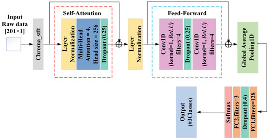 As shown in Figure 8, in this approach, we utilize the part of the transformer encoder network that is composed of the self-attention modules and feed-forward layers. This layer assists in accelerating the receptive field of self-localization features through the 4 multi-head attention layers with 256 head dimension size and feed-forward block to extract top-down encoded features. Each of which processes aggregate input feature maps to reweight and rescale from input feature representation. They can then be extracted into one-dimensional average pooling for our implemented signal samples and a fully connected (FC) layer of 128 filters with a dropout parameter value set at 0.4, next to the last fully connected layer of three filters which correspond to the number of classes. Finally, the final logit vector is turned through the SoftMax function and mapped to the label vector for inference assessment.
